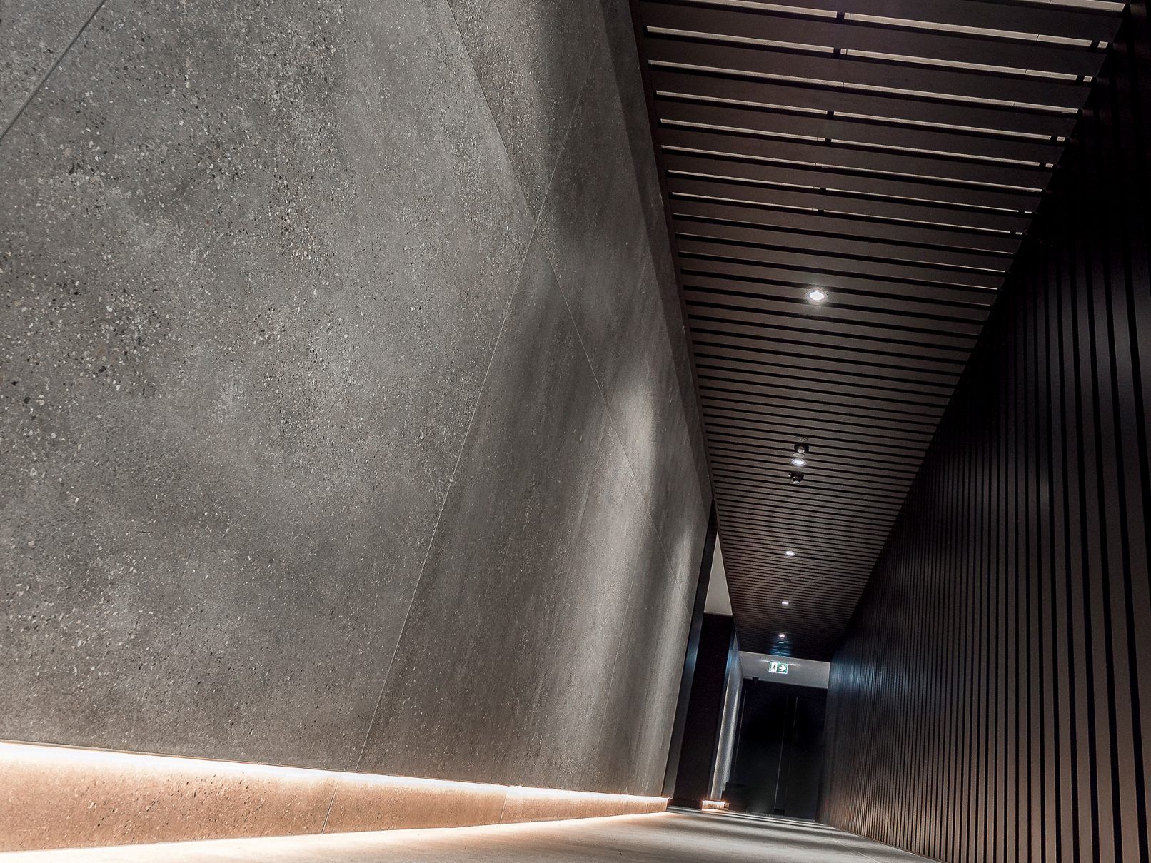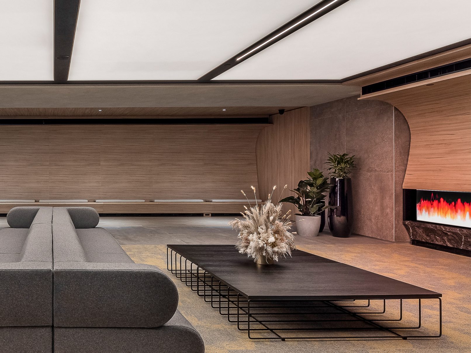 First impressions never have a second chance, and the entrance to 101 Moray Street doesn’t need one. As visitors enter, they are welcomed by open spaces, quality features, and stylish detail throughout. The striking timber grain bulkhead against the colourblack glass wall and ceiling promises luxury. The digital screen, LED perimeter lighting, and the abundant space with a view-through to curved lines and rounded forms within the foyer offers a contemporary perspective of a traditional commercial space.