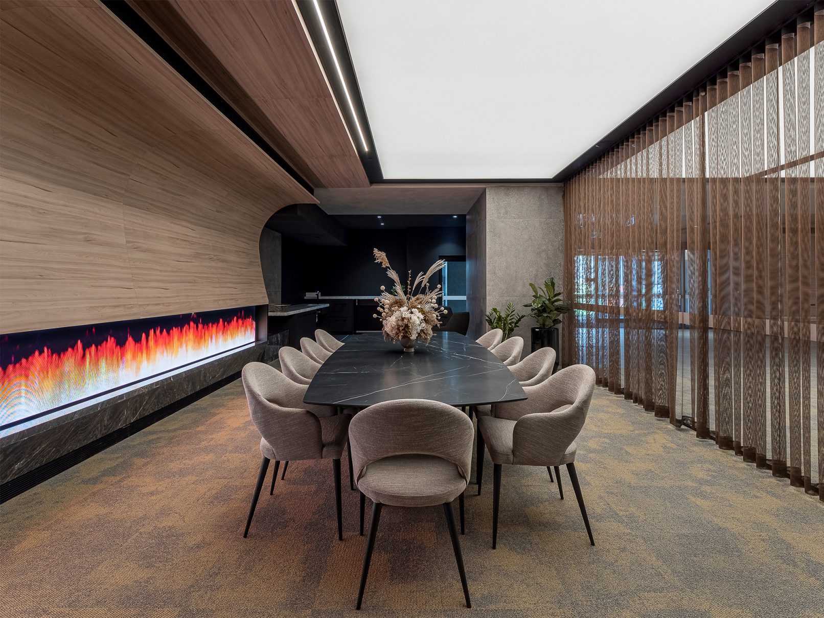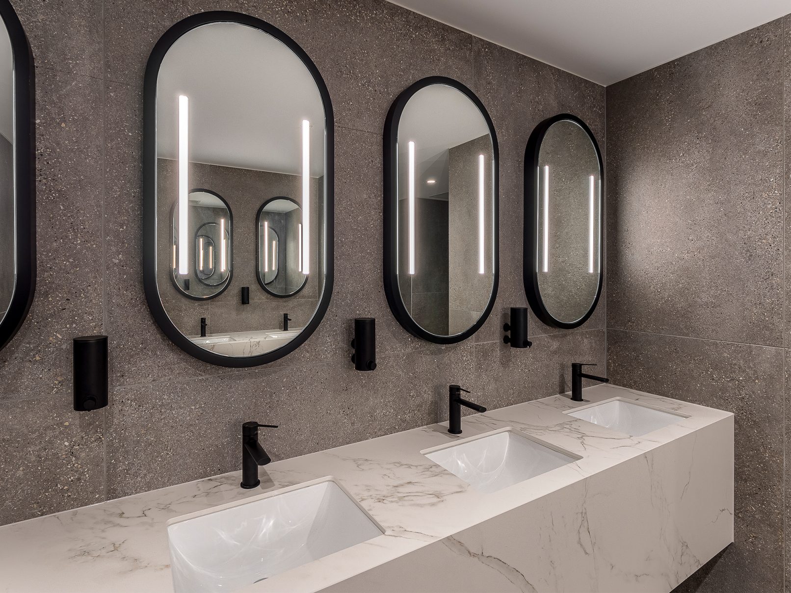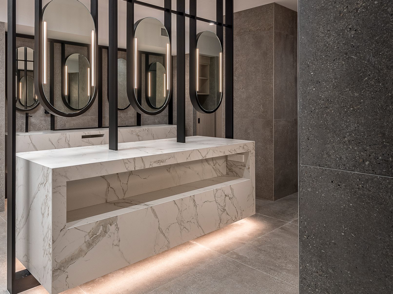 Contemporary luxury extends to the end-of-trip and bathroom facilities. A stylish kitchenette can be found just outside the spacious meeting area. The bathrooms boast porcelain vanity units held above the ground in a black steel powder coated frame. Each unit is fitted with ample power points and LED lighting along the baseline. Along with all of the bespoke joinery, the cleverly designed LED backlit mirrors were crafted by the talented team in the YVC factory.