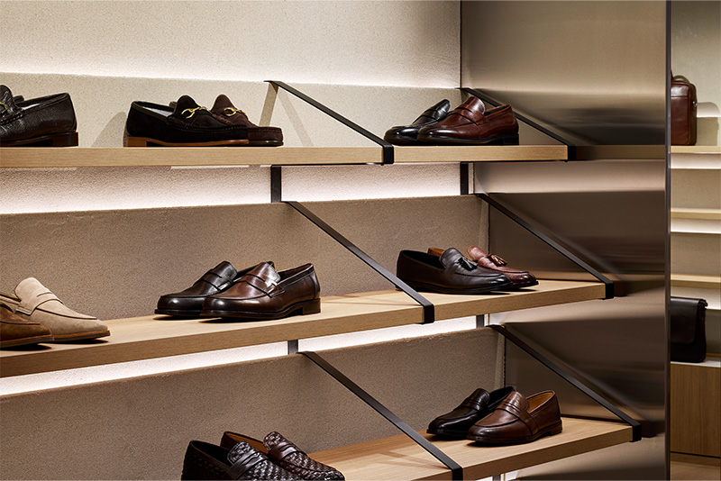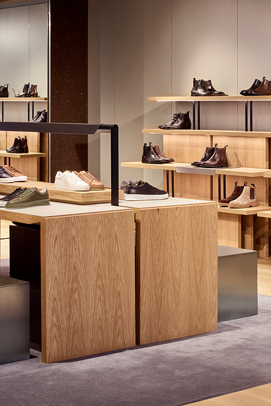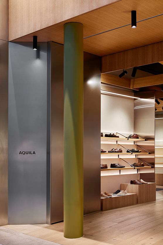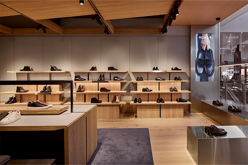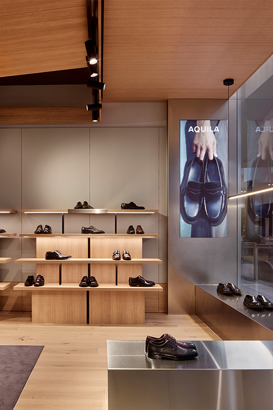 The Aquila store delivers a fit-out grounded in smart design and refined materials. Thoughtfully laid out to direct the flow of customers, the space features bespoke shelving and display units crafted to showcase shoes with both elegance and accessibility.