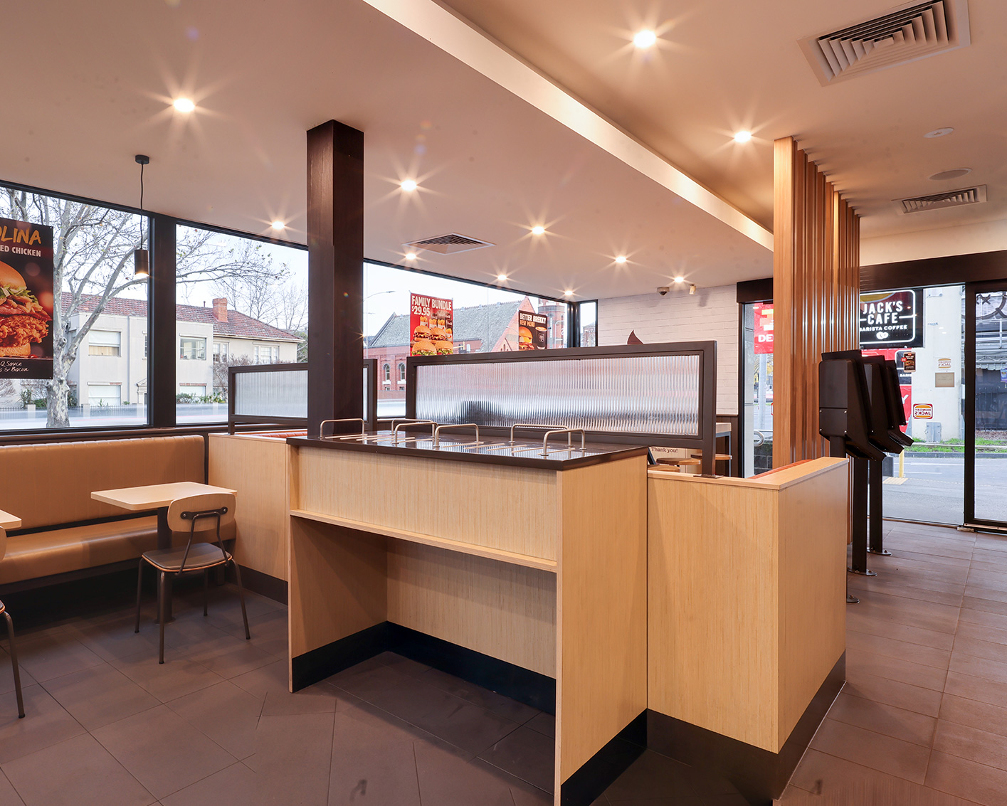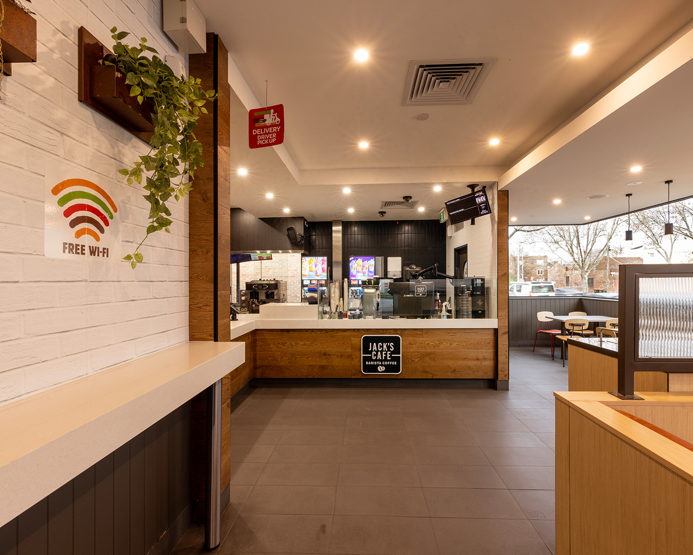 With a vision of spaciousness and integration, the aim was to unite the exterior and interior for an expansive dining atmosphere. Introducing roadside windows illuminated the space, connecting inside to out. External changes included demolishing concrete walls for structural renovations. The exterior showcased client-provided joinery and sleek blades, while the interior was modernised with stone counters, bespoke coffee stations, and contemporary cladding. Additionally, a state-of-the-art drive-through was established, featuring a sturdy concrete base and a modern canopy.