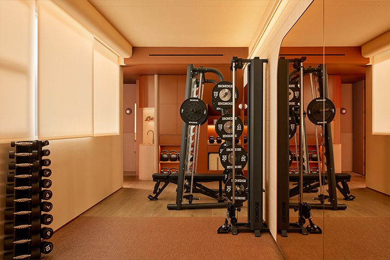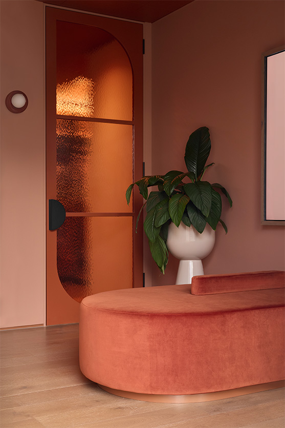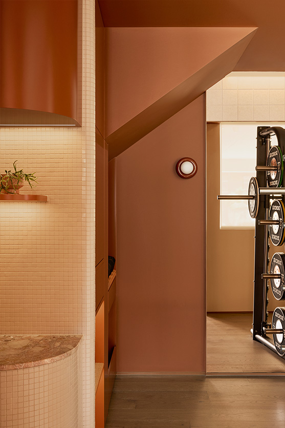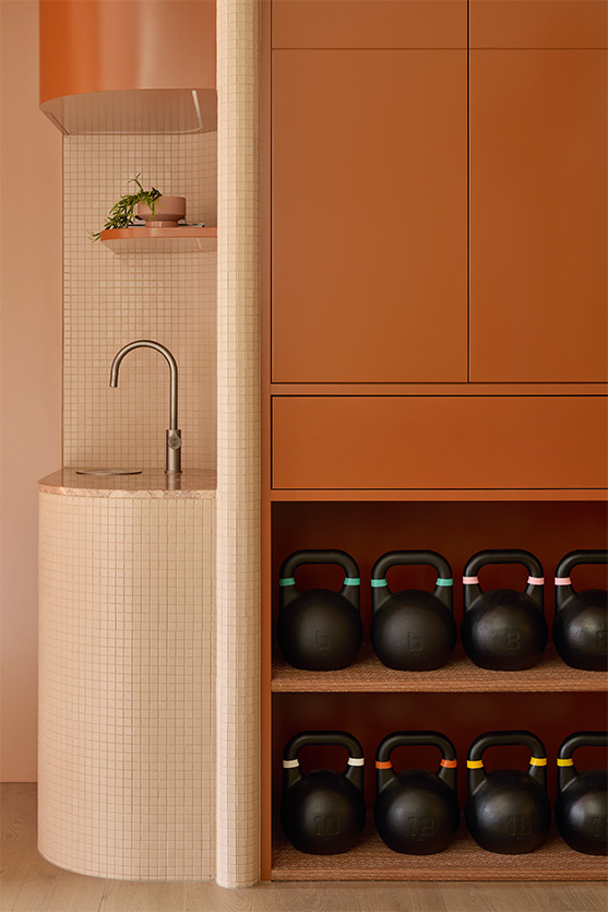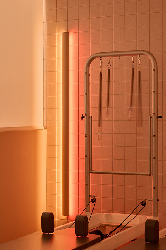 The reception at Inspire Pilates Beaconsfield sets an immediate tone of sophistication and ease. Soft blush and terracotta tones pair with sheer drapery that diffuses natural light, giving the space a gentle warmth. The open layout is designed to feel welcoming without feeling sparse, with seating and custom joinery arranged to offer both comfort and flow. Every surface, from the reception counter to the flooring, has been selected for its balance of elegance, durability, and a finish that invites clients to settle in before their session.