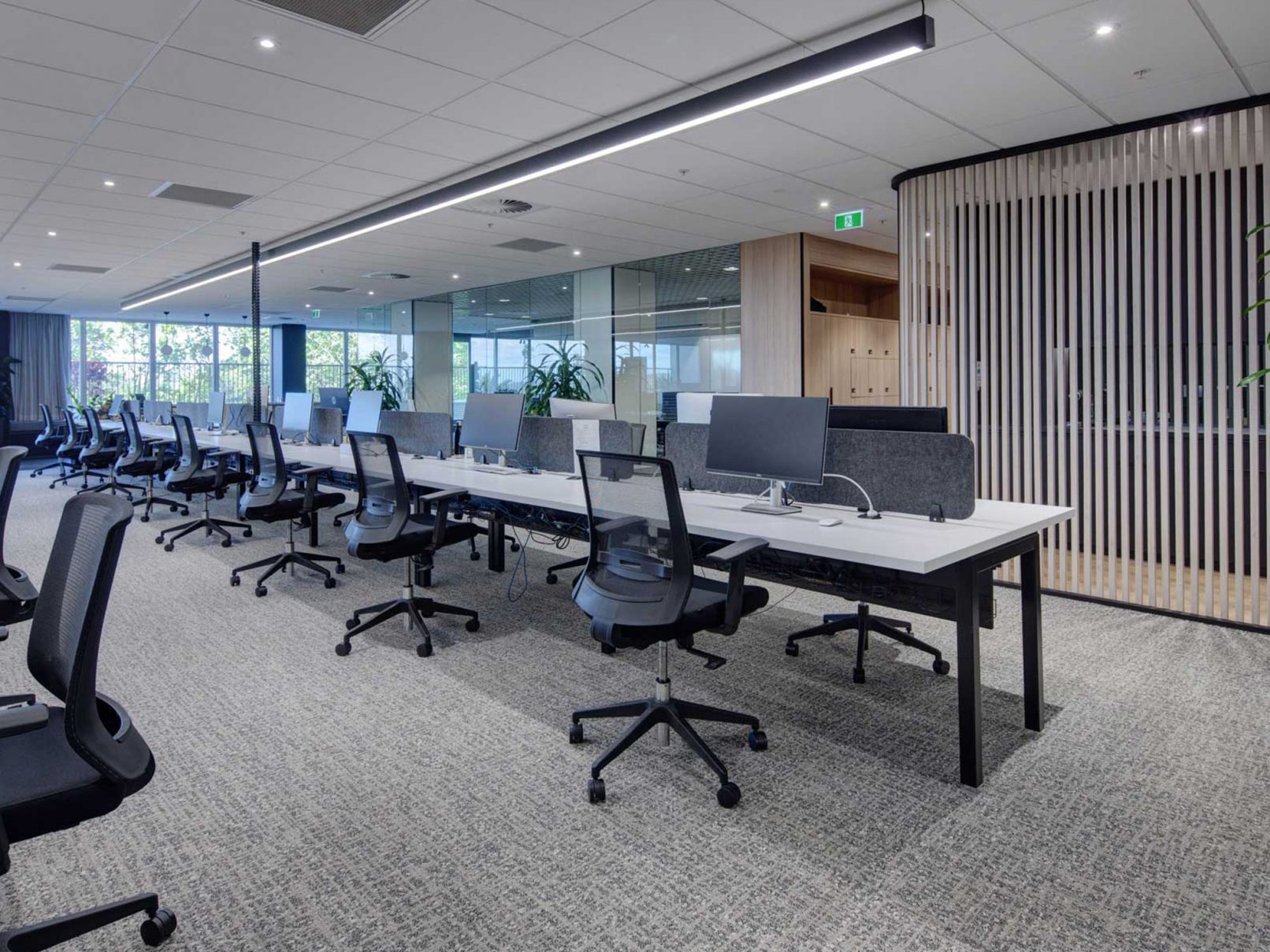 Flood damage became the catalyst for this head office overhaul which saw 500sq m of floor space transformed. The hybrid timber flooring was just the beginning. Each wall cladded with textured feature panels and each front window, fitted with caeser stone bench seating. A contemporary open plan workspace now accommodates up to fifty team members with custom made workstations crafted by the Yarra Valley Commercial team, all out of the Melbourne factory.