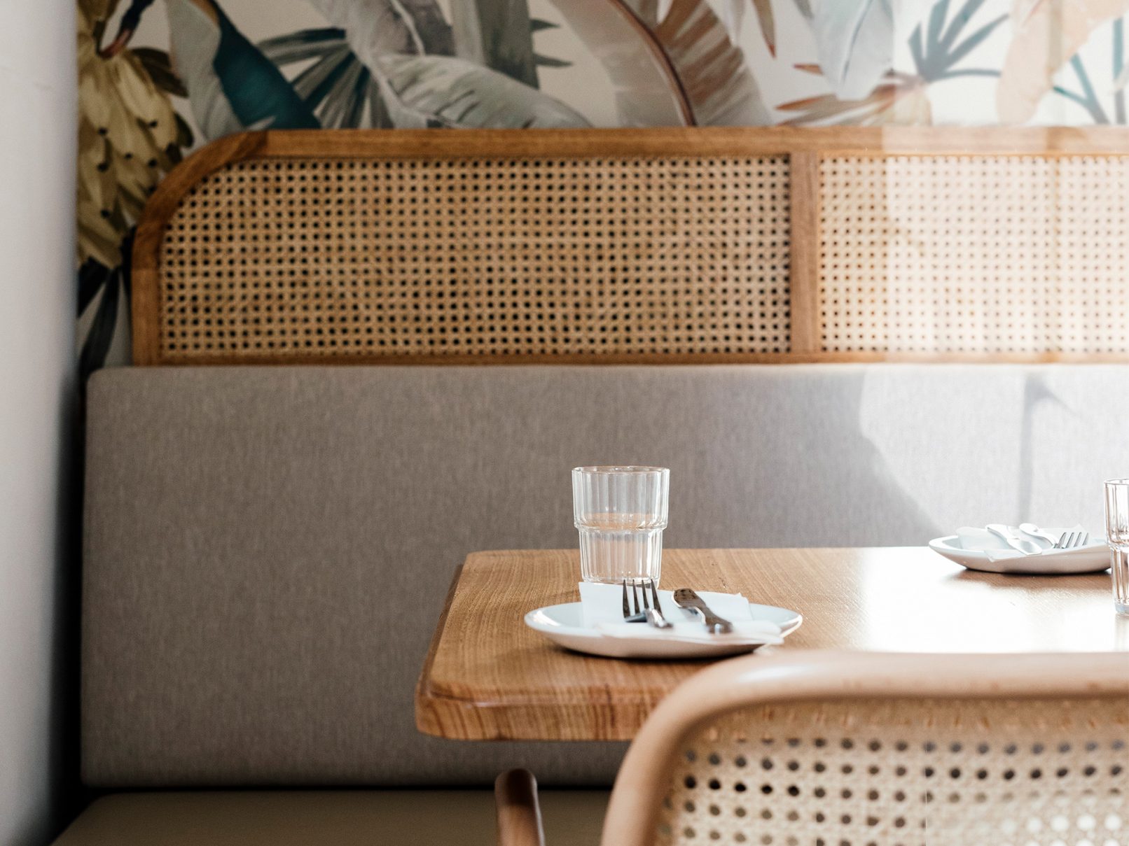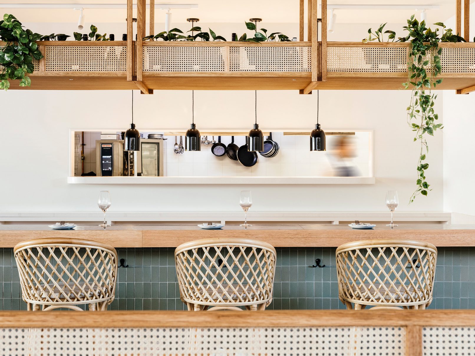 One of the main highlights also proved to be one of the more challenging aspects of the install. The overhead bar area features a timber and rattan framework of complex joinery designed to accommodate the different ceiling levels. Deliverables included CAD programming as well as inhouse production of bespoke joinery items. Yarra Valley Commercial project managed the installation.