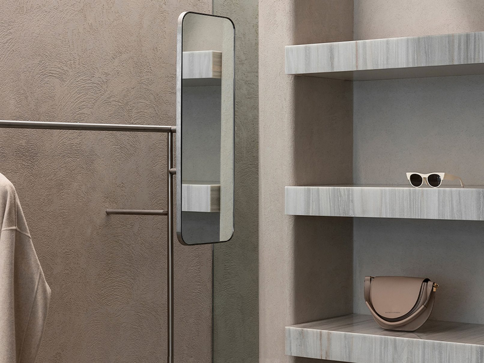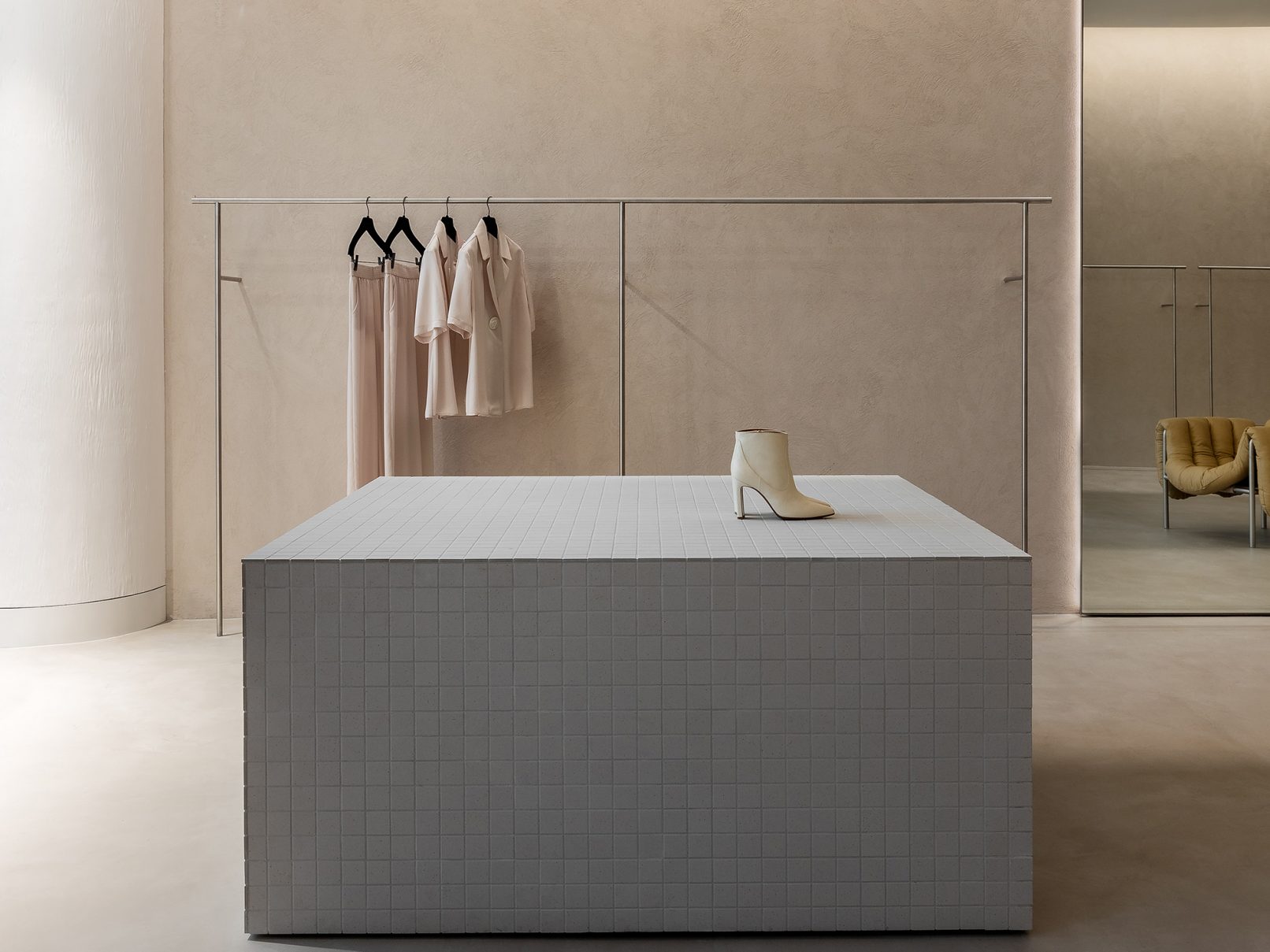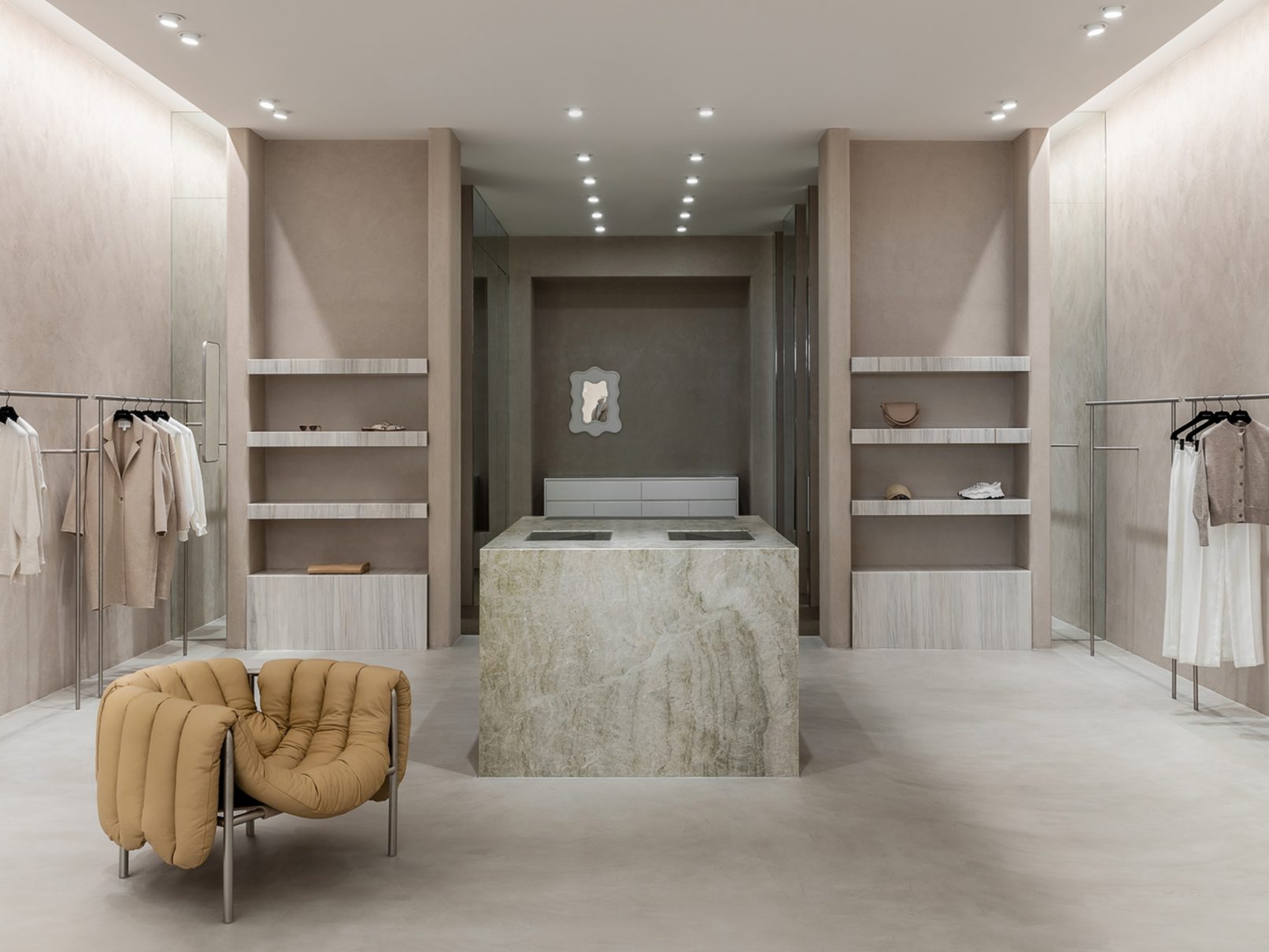 The highlight of this project came from working so closely with the innovative design team, GOLDEN, and the talented and visionary Viktoria & Woods group. In this industry, such synergy in collaboration is rarely experienced. At a glance, the space appears effortless and minimalist. Deception lies in the detail required to achieve such simplicity. The natural stone counter weighing up to 300kg is a handmade feature delivered on-site piece by piece, carefully constructed to create a stunning customer touchpoint. From the customised wall render to the hand-crafted product displays, illuminated clothes rails, and shoe plinths, it’s a fluid customer journey that showcases the Viktoria & Woods’ product in a gallery-like environment.